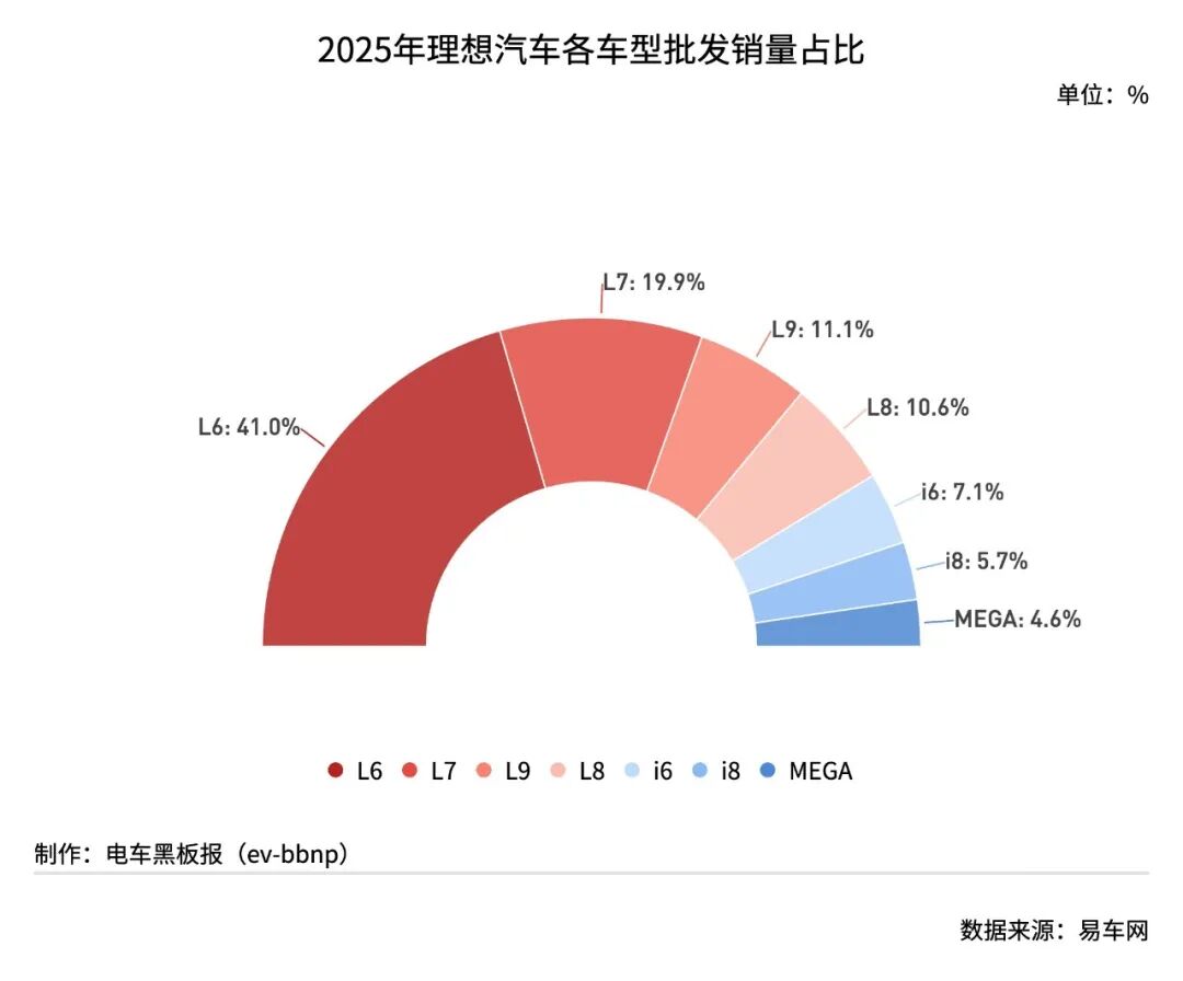 理想汽车的基本盘仍然是代表增程车型的L系列,交付主力则是定价最低的理想L6。2025年,理想L6累计批发销量同比下降13.4%至16.65万辆;占比从上一年的38.4%提升至41%,主要受公司交付总量基数降低影响。
