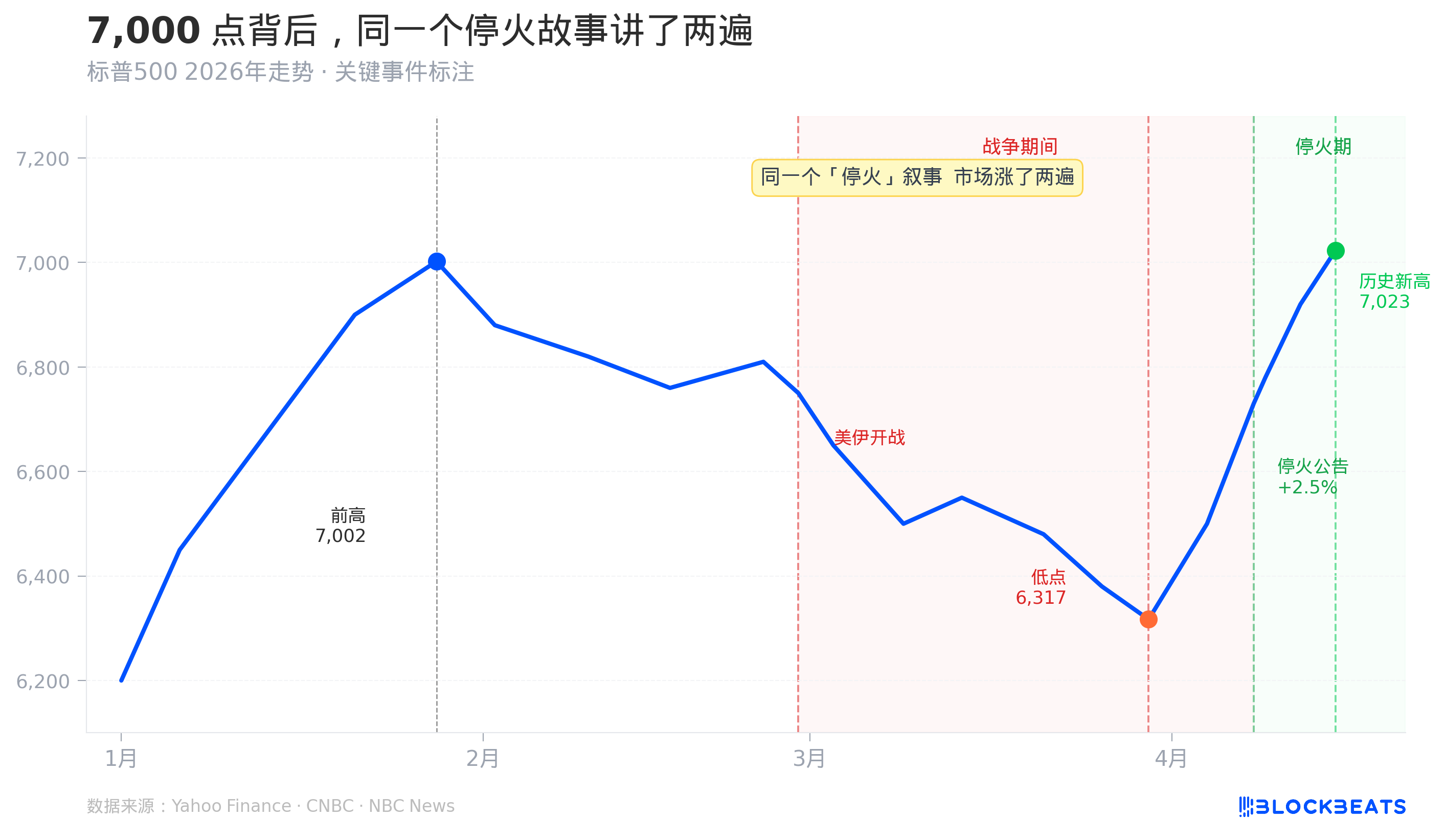 4 月 8 日,特朗普在社交媒体宣布两周临时停火,伊朗方面也接受了巴基斯坦的斡旋方案。标普 500 单日暴涨 2.5%。这是第二次「停火定价」,价格更高,理由几乎一模一样。