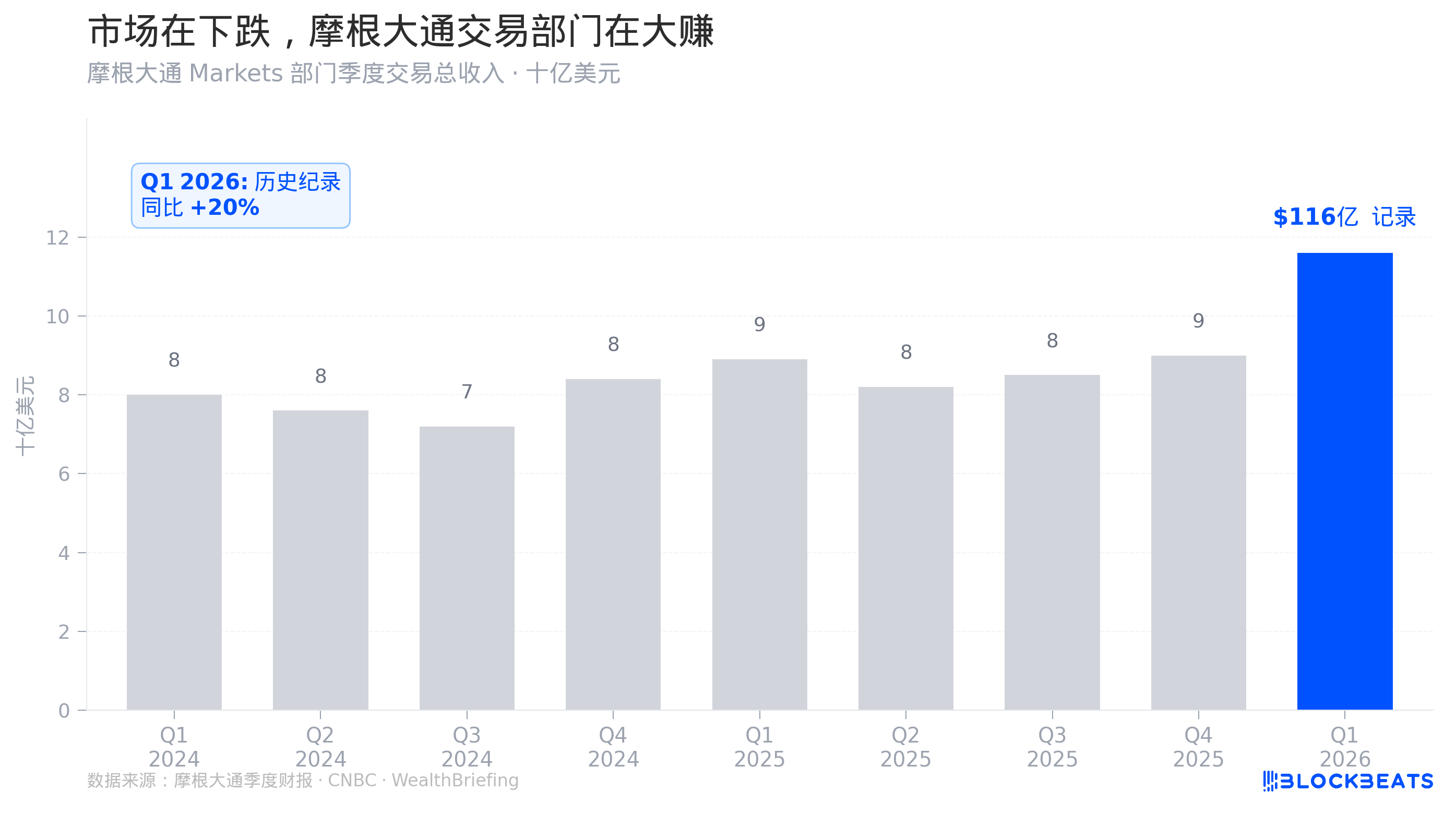 从图表 4 可以看到,摩根大通 Q1 2026 的交易收入柱子,比前面八个季度都要高得多。这不是一个边际改善,而是一个跳升。