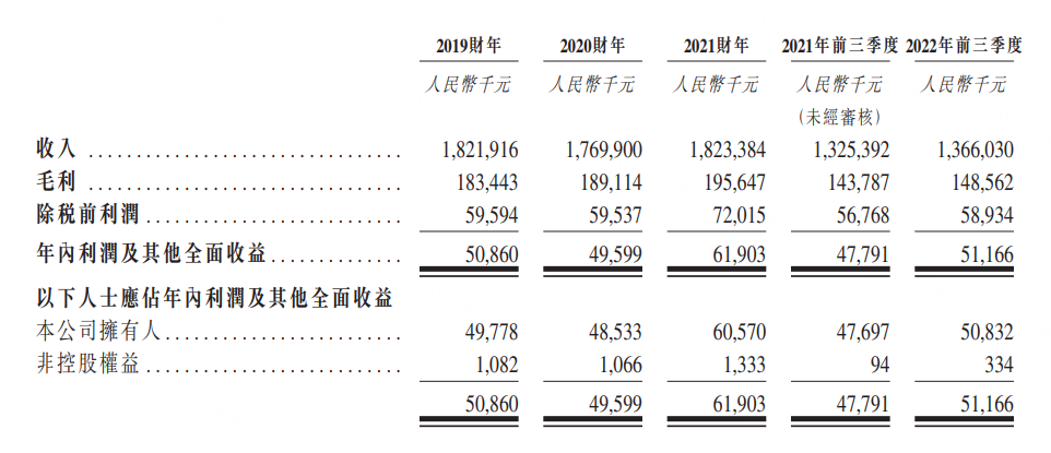 于2019财年、2020财年及2021财年,公司分别实现收入18.22亿元、17.7亿元及18.23亿元(人民币,下同),实现年内利润及其他全面收益5086万元、4960万元及6190.3万元。