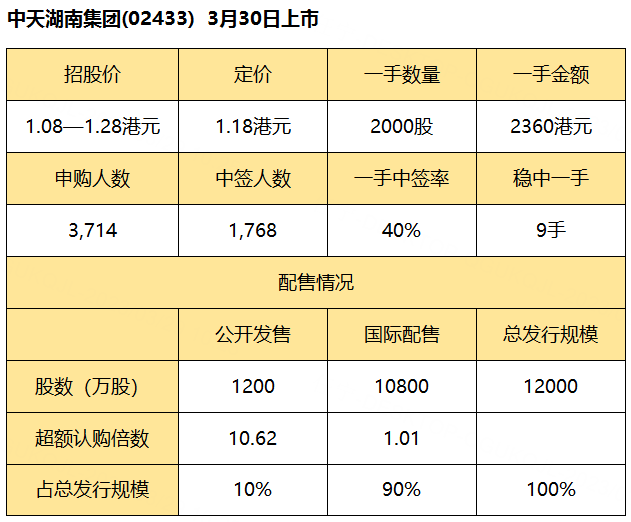公开发售阶段中天湖南集团获约10.62倍认购,分配至公开发售的发售股份最终数目为1200万股,占发售股份总数的约10%(任何超额配股权获行使前)。合共接获3714份有效申请,一手中签率40% ,认购9手稳中1手。