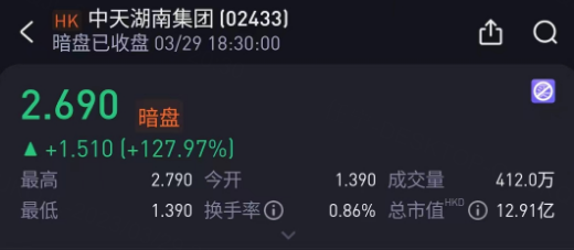 3月29日,中天湖南集团老虎暗盘收盘价报2.69港元,较招股价1.18港元涨127.97%。每手2000股,不计手续费,每手赚3020港元。