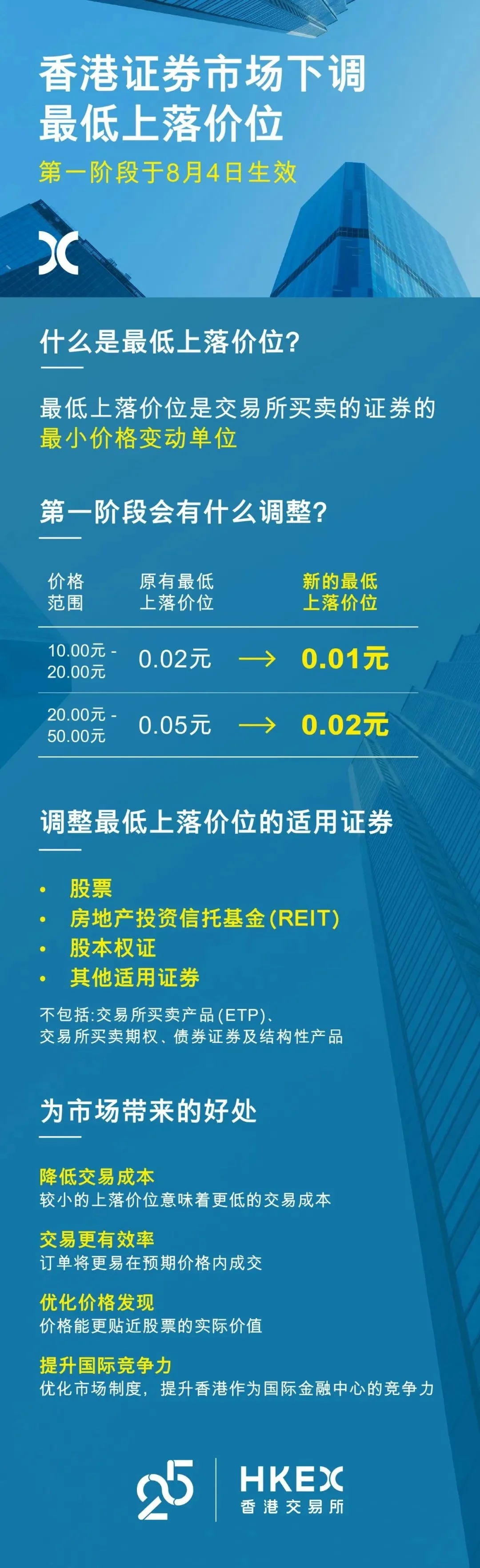 7月28日,香港交易所宣布分阶段下调证券市场最低上落价位,首阶段将于2025年8月4日实施,涉及10-50港元价格区间股票及房地产信托基金等证券品种,调整幅度达50%-60%。此次调整旨在提升交易效率并降低投资者隐性成本。