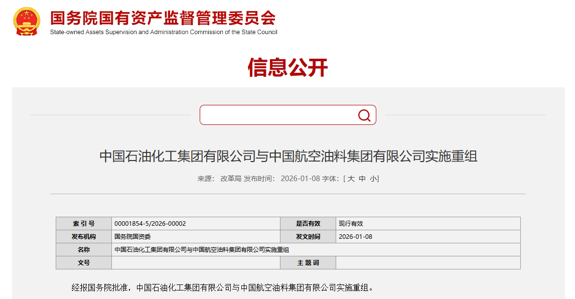 据国资委网站,经报国务院批准, 中国石油化工股份 集团有限公司与中国航空油料集团有限公司实施重组。