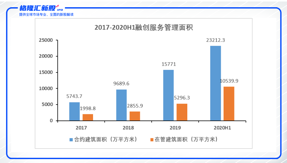 显然,融创服务营收和利润飙升,离不开其在管建筑面积和合约建筑面积的快速增长。截至2020年6月30日,融创服务经营范围覆盖中国29个省、自治区及直辖市的127个城市,其中在管物业中有86.1%位于中国的一线及二线城市;合约建筑面积由2017年末的5740万平方米,增长至2020年6月底的2.321亿平方米,年复合增长率74.9%;在管建筑面积则由2017年末的2000万平方米,增长至2020年6月底的1.054亿平方米,年复合增长率94.5%。2020年6月末,融创服务合约管理面积为在管面积的2.2倍,可见庞大的储备面积能够为融创服务的持续高速增长积蓄充足增长势能。