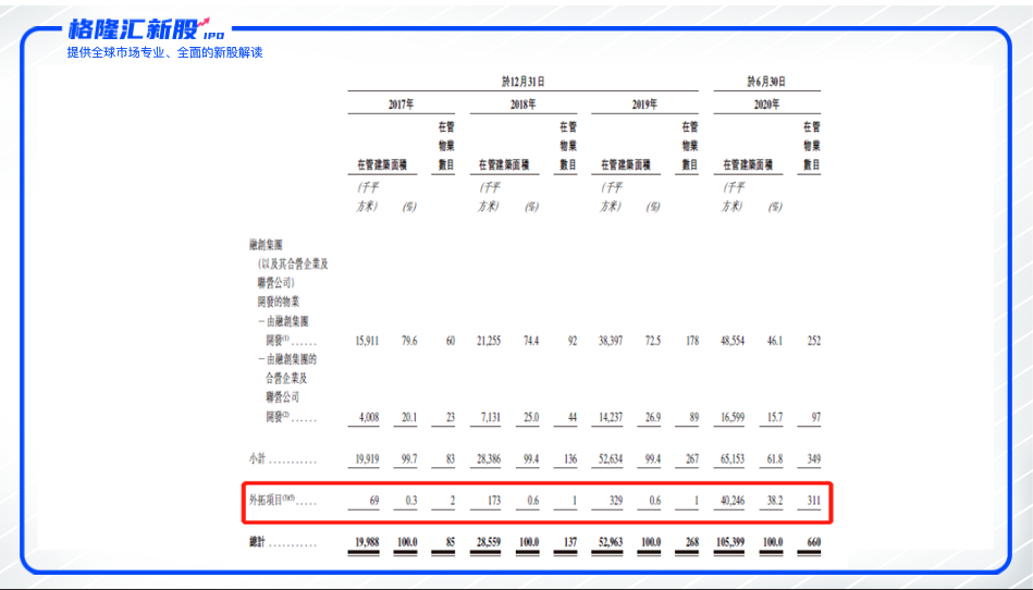 另外,融创服务为了摆脱对母公司的依赖,今年5月收购了开元物业管理来提升外拓能力。开元物业主要布局在华东地区核心城市,非住宅物业占比达32.6%,涵盖城市公共物业、写字楼、医院、商业等多种,且开元物业90%的合约建筑面积均来自于第三方。从招股书上也可以看出,2019年末,融创服务外拓项目才1个,收购开元物业后,2020年6月底显示外拓项目为311个,涉及在管建筑面积4024.6万平方米,占全部在管面积的比重为38.2%。开元物业的加入无疑能弥补融创服务“独立第三方”物业不足的短板,加强了融创服务的外拓能力,扩大了管理规模,进一步巩固了其市场地位。