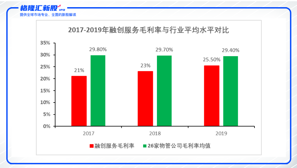 从毛利率来看,融创服务在2017年-2019年的整体毛利率分别为21%、23%及25.5%,呈持续上升态势。但是,据中国物业管理协会、上海易居房地产研究院中国房地产测评中心发布的数据,截至2020年4月30日之前已经在A股、H股上市的26家内地物管公司,近三年毛利率均值分别为29.8%、29.7%、29.4%,融创服务近三年都略逊于行业平均水平。拿母公司实力尚在融创中国之下的金科服务和世茂服务来说,后两者2017-2019年间毛利率分别为26.8%、25.7%、27.3%和27.45%、29.35%、33.67%,毛利率也都在融创服务之上。