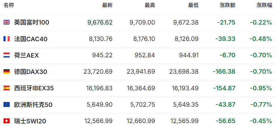 欧洲主要股指全线下跌,截至发稿,英国富时100跌0.22%,法国CAC40跌0.48%,德国DAX30指数跌0.09%。