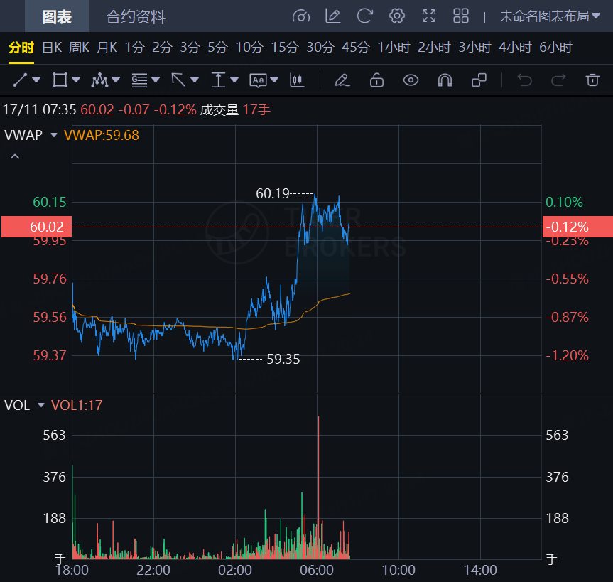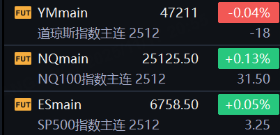11月17日,美股三大股指期货冲高回落,截止发稿,道指期货跌0.04%,纳指期货涨0.13%,标普500指数期货涨0.05%。