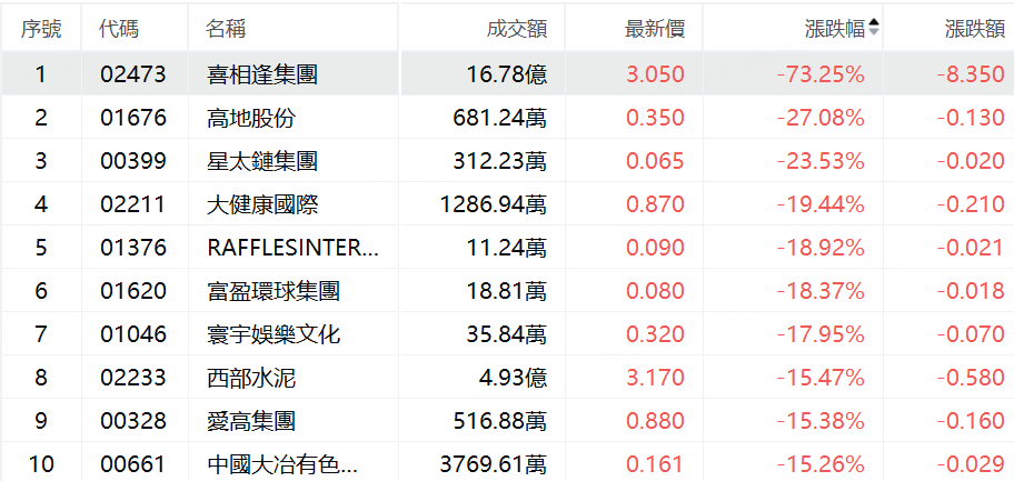 四、港股今日跌幅TOP10