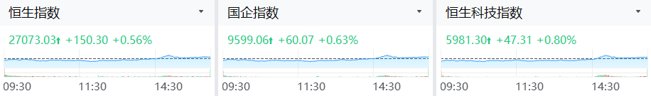 港股三大指数齐涨, 恒生指数涨0.56%,恒生科技指数涨0.80%,国企指数涨0.63%。