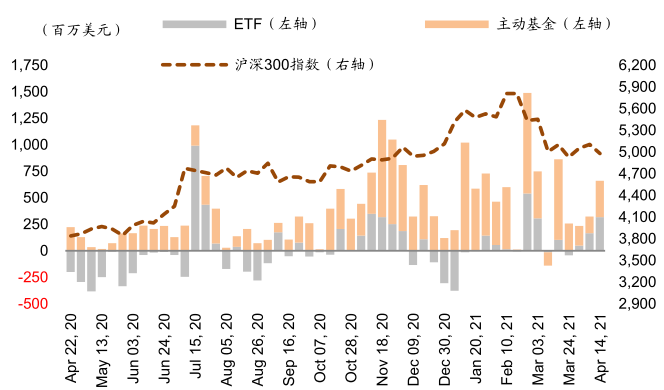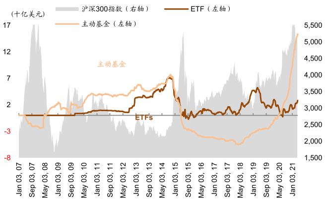图表: 专注投资A股的海外基金累计净申购:主动基金/ETF