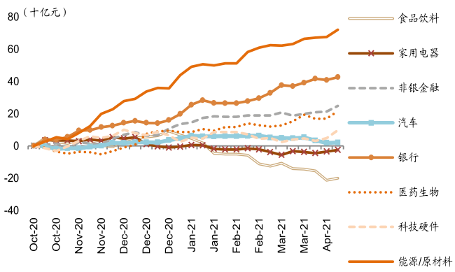 图表:科技硬件、能源/原材料连续数周获北上资金的净买入