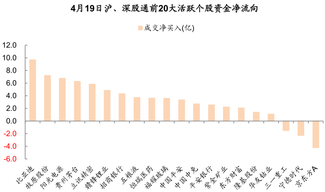 图表: 4月19日北上资金流入较多的是新能源产业链、白酒、科技硬件和银行龙头