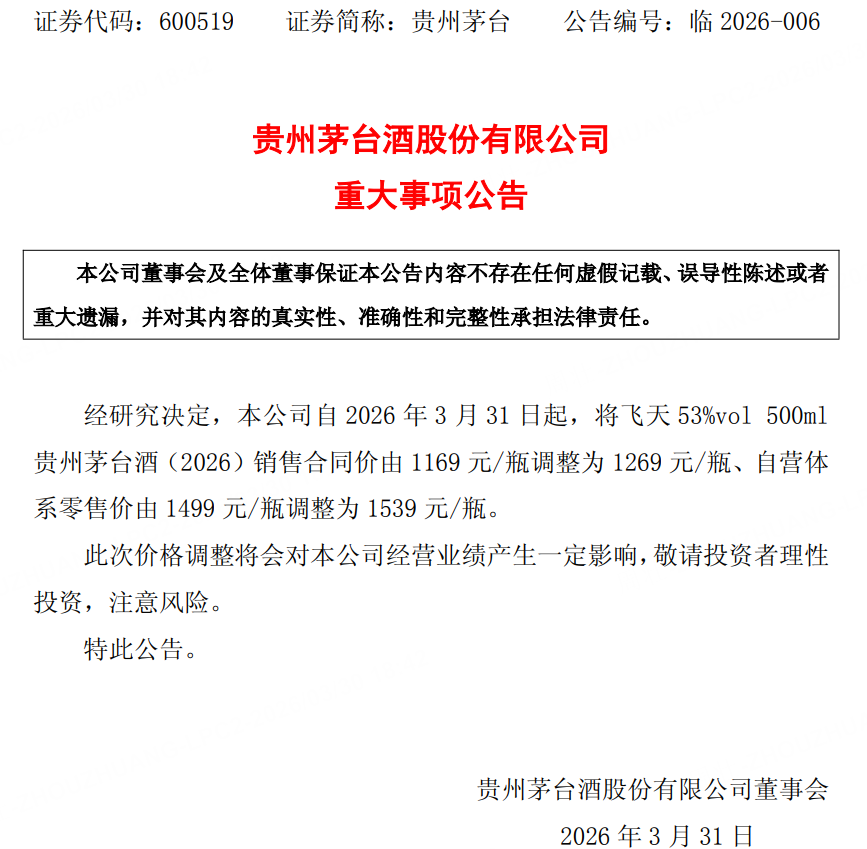3月30日,据贵州茅台公告,经研究决定,本公司自2026年3月31日起,将飞天53%vol500ml贵州茅台酒(2026)销售合同价由1169元/瓶调整为1269元/瓶、自营体系零售价由1499元/瓶调整为1539元/瓶。此次价格调整将会对本公司经营业绩产生一定影响,敬请投资者理性投资,注意风险。
