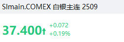 白银微涨0.19%,报37.4元/盎司。