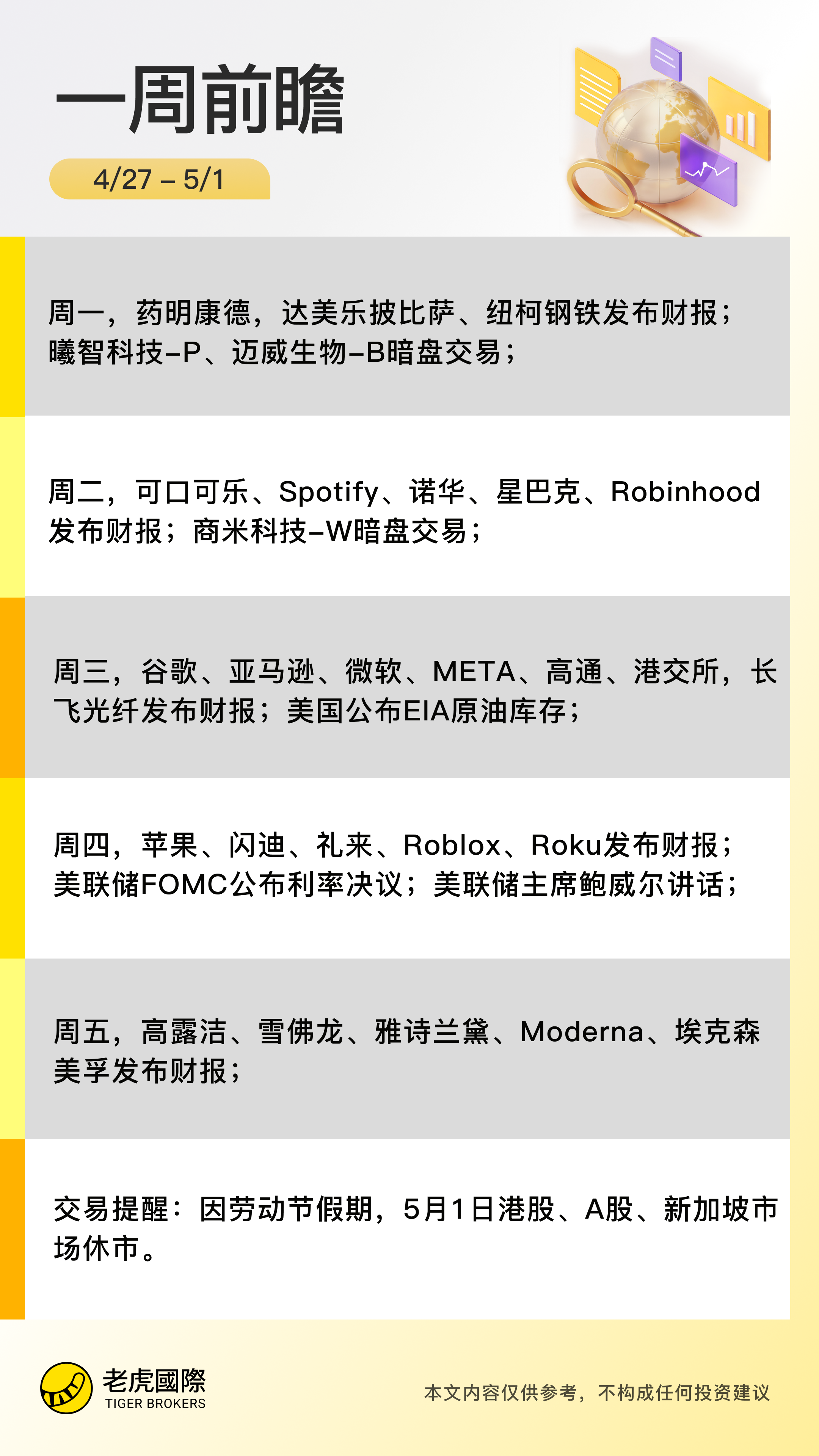 业绩:诺华、康宁、英国石油、可口可乐、Spotify、通用汽车、联合包裹、捷蓝航空、巴克莱银行(盘前),Visa、恩智浦、星巴克、希捷科技、淡水河谷、Robinhood、Bloom Energy、Booking Holdings(盘后)发布财报;港股中国平安、中国太保、招商银行、奇瑞汽车、比亚迪股份、中广核电力、中国海洋石油、中国石油化工股份发布财报。