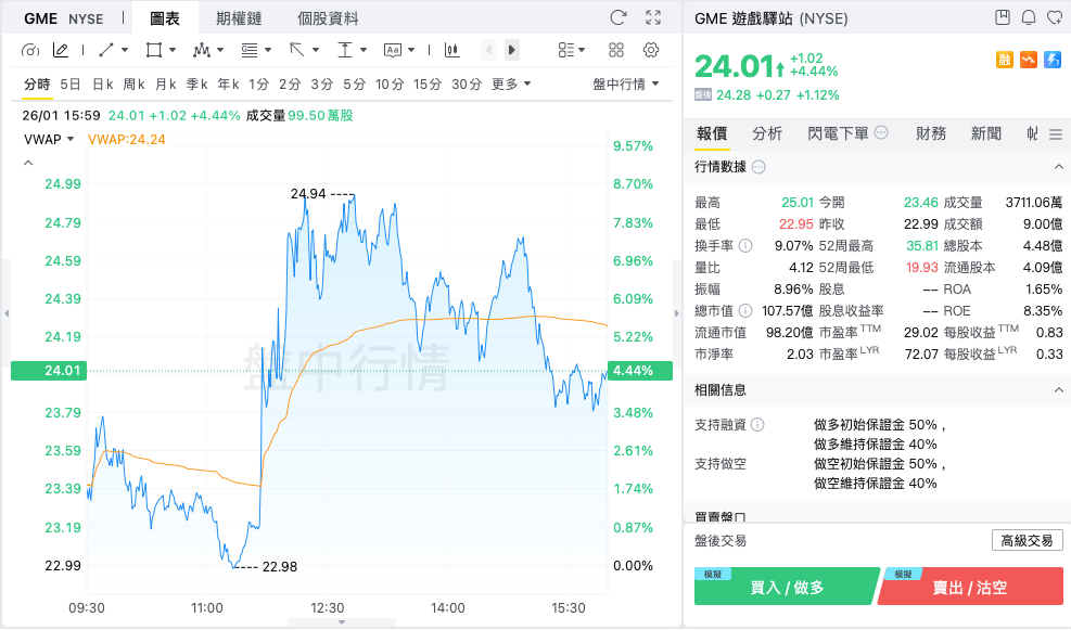 受消息刺激,游戏驿站周一盘中股价一度上涨8.8%,高见25.01美元。截至收盘,收涨4.44%,报24.01美元。