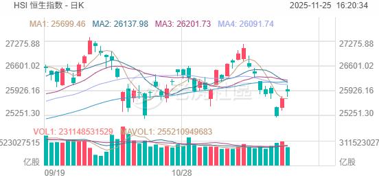 11月25日,受地缘政治缓和以及美联储降息预期影响,市场风险情绪回升明显。港股三大指数延续昨日反弹,恒生指数涨0.69%盘中一度重回26000点上方,国企指数、恒生科技指数分别上涨0.87%及1.2%,恒科指一度冲高至2.2%。