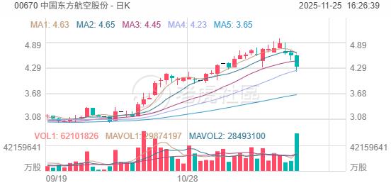 航空股持续回调,中国东方航空股份跌近6%,中国国航跌超3%,中国南方航空股份跌近2%;