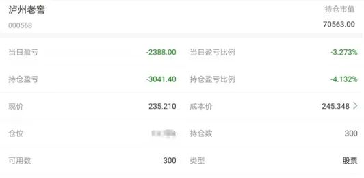 2月24日,丹阳在泸州老窖股价跌至247元时入手了200股,25日240元时再入手100股,到26日收盘时浮亏3041元;而春节前入手的洋河股份盈亏平衡,只是早前账上浮盈的几千块钱像泡沫一样消失了。