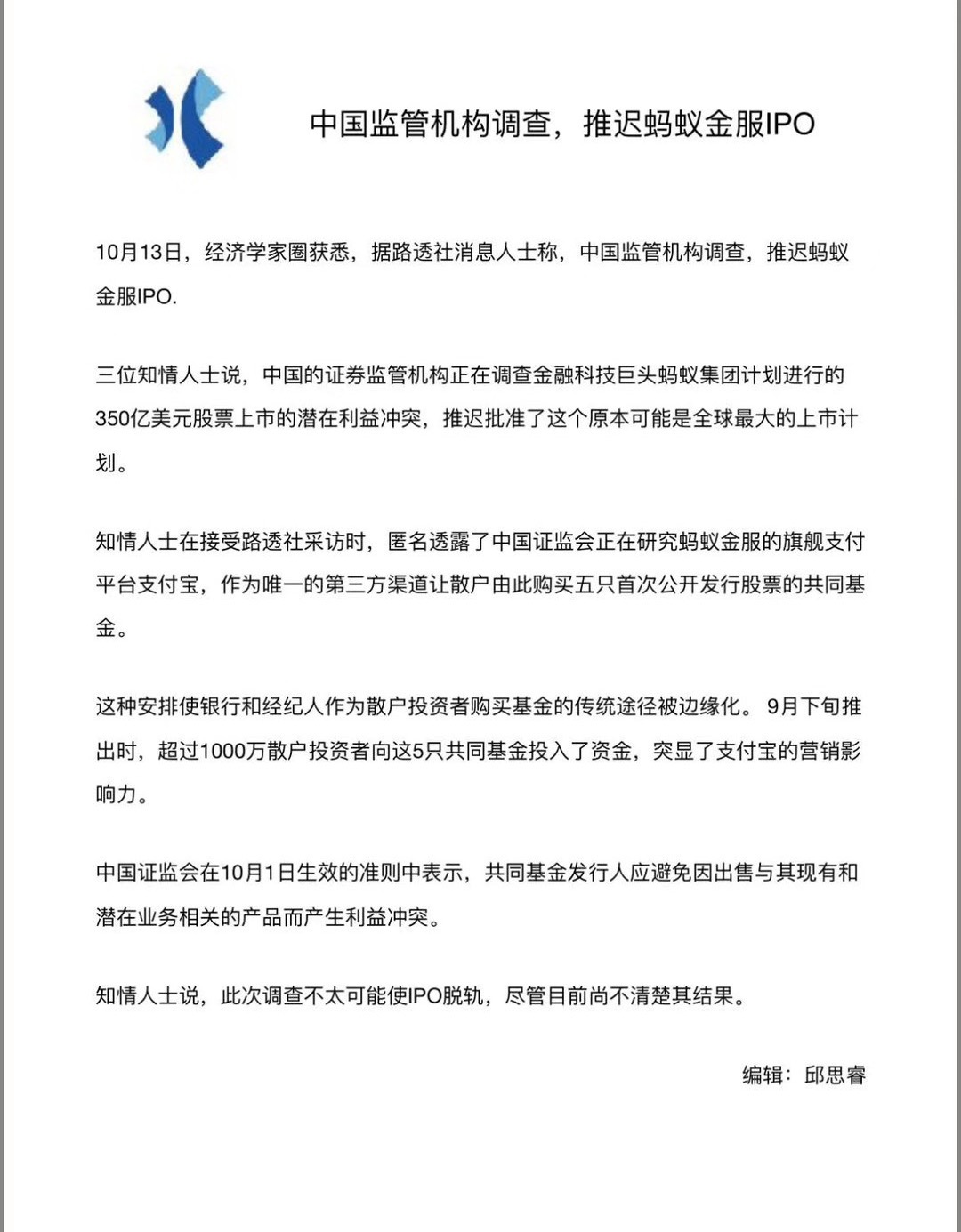 此前有传闻,中国监管机构调查,推迟蚂蚁金服IPO。