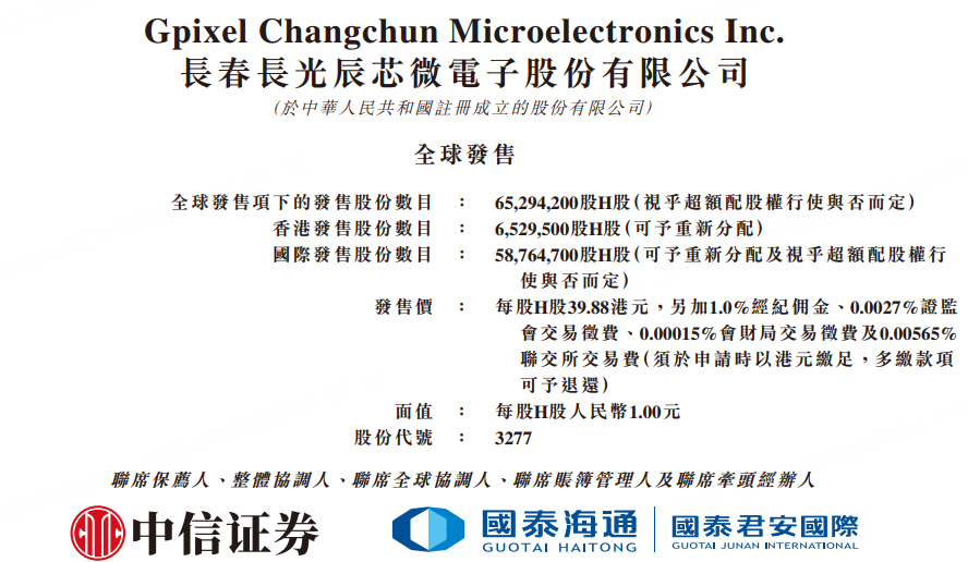 4月9日,长光辰芯(03277)发布公告,公司拟全球发售6529.42万股H股,中国香港发售股份652.95万股,国际发售股份5876.47万股(以上可予重新分配及视乎超额配股权行使与否而定);4月9日至4月14日招股;发售价将为每股发售股份39.88港元,H股的每手买卖单位将为100股,中信证券及国泰君安国际为联席保荐人;预期H股将于4月17日开始于联交所买卖。