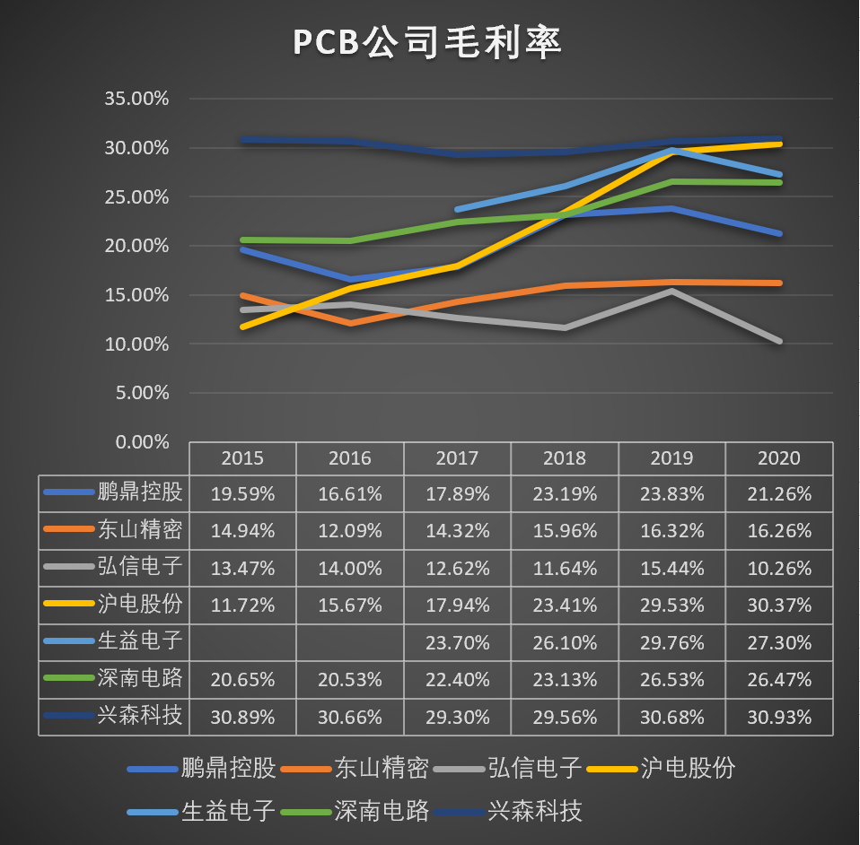 PCB厂商因为议价能力偏弱,多数公司毛利率在16-17年不升反降,直到18年开始回升。