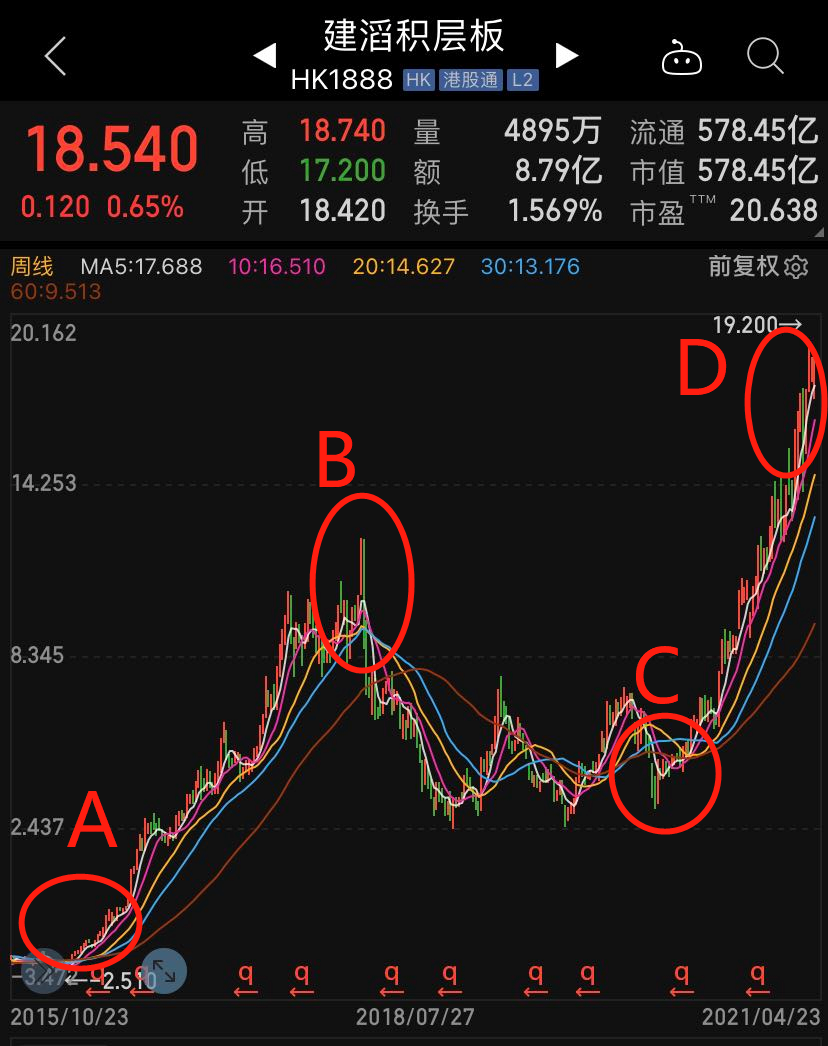 建滔积层板(HK:01888),覆铜板老龙头,港股上市公司,产能大,但近几年营收增长萎靡,基本沦为纯粹的周期股,股价和覆铜板价格关系密切。16年初到18年初(A到B)股价一波波疯狂上涨,20年3月至今(C到D)基本复制上一波,已经涨了6倍。