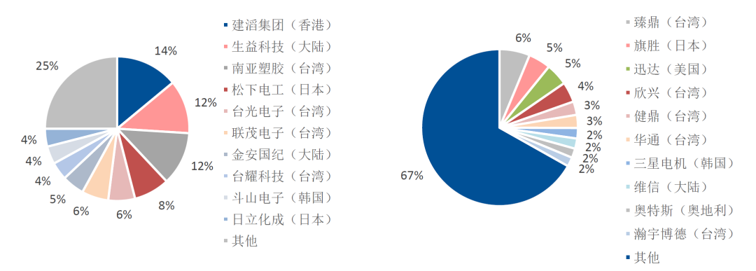 左图:2018年全球前十大覆铜板厂商市占率;右图:2018年全球前十大PCB厂商市占率。来源:Prismark,民生证券。