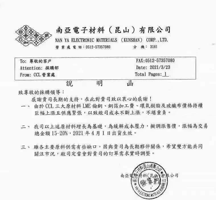 所以,覆铜板厂商已经开始调价,普遍涨价20%左右。