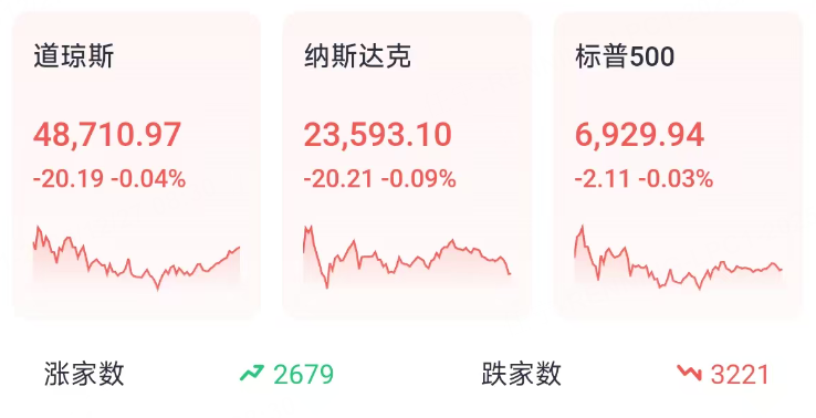 周五(12月26日),截至收盘,道指跌20.19点,跌幅为0.04%,报48710.97点;纳指跌20.21点,跌幅为0.09%,报23593.10点;标普500指数跌2.11点,跌幅为0.03%,报6929.94点。