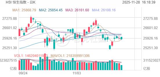 11月28日,港股三大指数涨跌互现,恒生指数、国企指数分别下跌0.34%及0.38%,恒指盘中曾短暂回到26000上方,恒生科技指数微涨0.02%表现相对平稳。