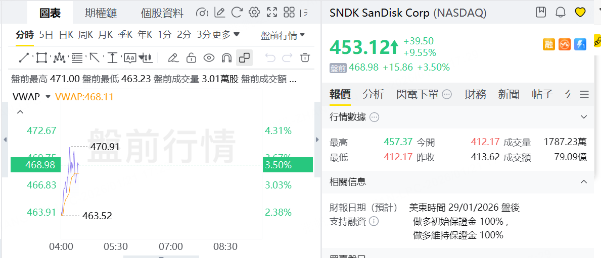 内存股续造好,SanDisk盘前升3%,美光、西部数据升2%,希捷科技升1%。