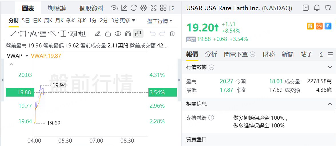 美股稀土概念、黄金股盘前走高,USA Rare Earth升逾3%,Critical Metals、Energy Fuels涨超2%;伊格尔矿业、泛美白银涨超3%,科尔黛伦矿业、哈莫尼黄金涨超2%。