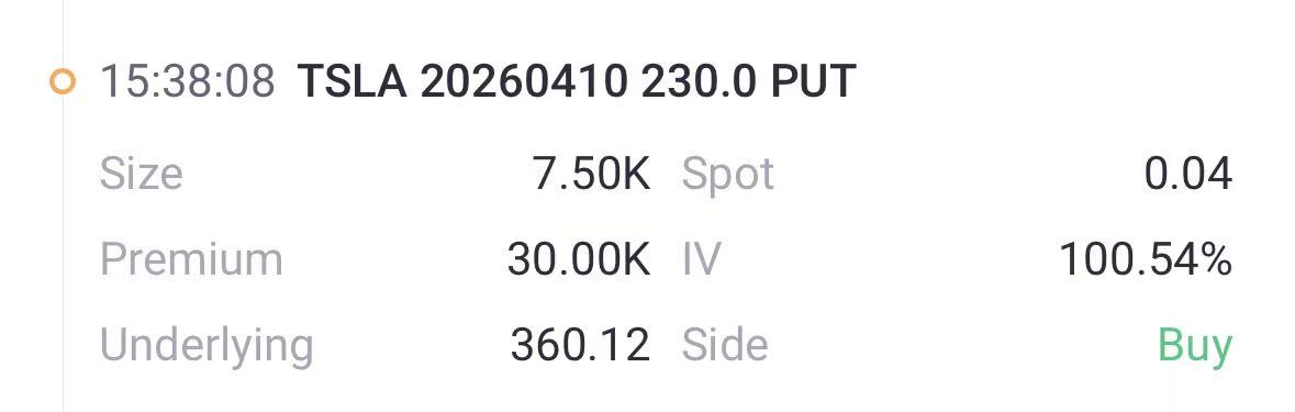 廉价看跌保护: 另有买入7,500张行权价230美元的远月深度虚值看跌期权,成本极低,类似为极端下跌风险购买的“保险”。$TSLA 20260410 230.0 PUT$