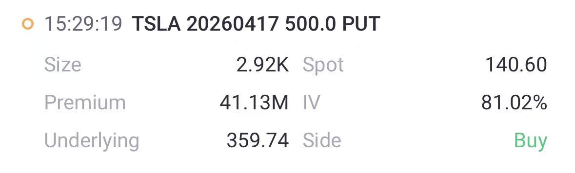 巨额对冲或看空: 出现一笔买入2,925张2026-04-17到期、行权价500美元的深度实值看跌期权的大单,成交额高达4113万美元。同时段还出现了一笔卖出相同到期日、行权价450美元的看跌期权,或是在构建复杂的熊市看跌价差策略,对冲现有股票头寸的下行风险。$TSLA 20260417 500.0 PUT$
