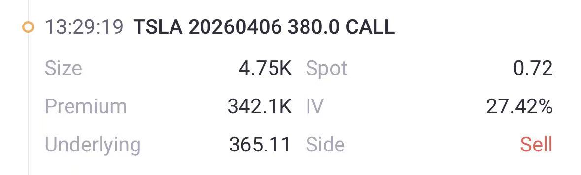 短线看涨情绪受制: 同时,有一笔卖出4,751张2026-04-06到期、行权价380美元的虚值看涨期权的大单,这可能是投资者认为股价短期内难以突破380美元,通过卖出看涨期权来收取权利金。$TSLA 20260406 380.0 CALL$