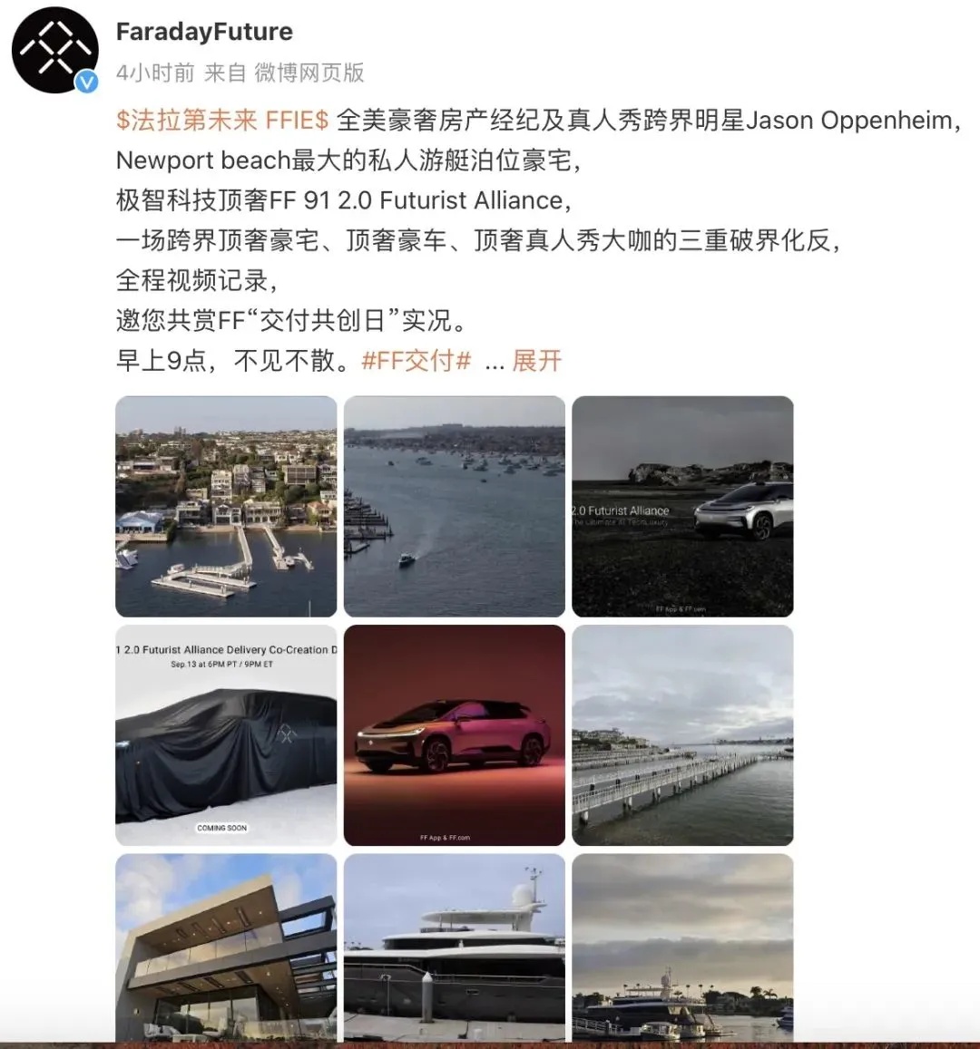9月14日,FF新车交付的车主是全美顶奢房产经纪大亨,同时也是真人秀跨界明星热剧“Selling Sunset”男一号和制片人Jason Oppenheim,交付现场定在Jason代理的坐落于加州顶奢富人区Newport Beach的游艇码头豪宅。