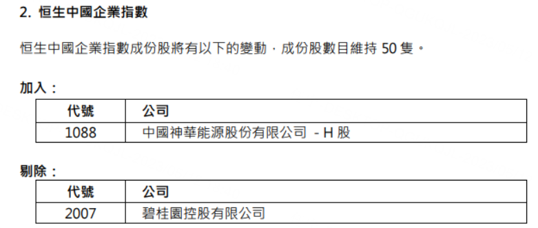 将中国神华纳入恒生中国企业指数,剔除碧桂园。