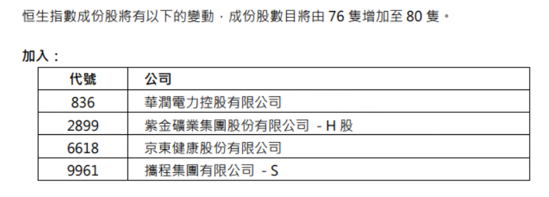 恒生指数公司:将京东健康、携程集团-S等4只股票纳入恒生指数。
