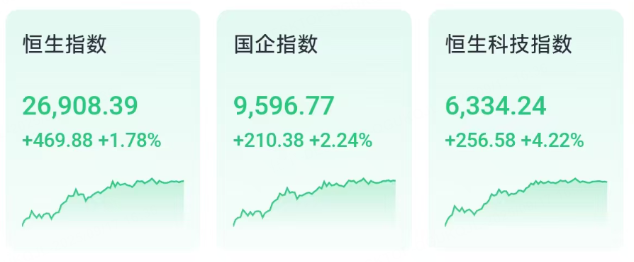 9月17日周三,港股三大指数全天呈单边上涨行情,市场做多情绪高涨。在权重科技股的助力下, 恒生科技指数 大幅收涨4.22%,恒生指数涨1.78%逼近27000点大关,国企指数涨2.24%,三者均刷新阶段高位。