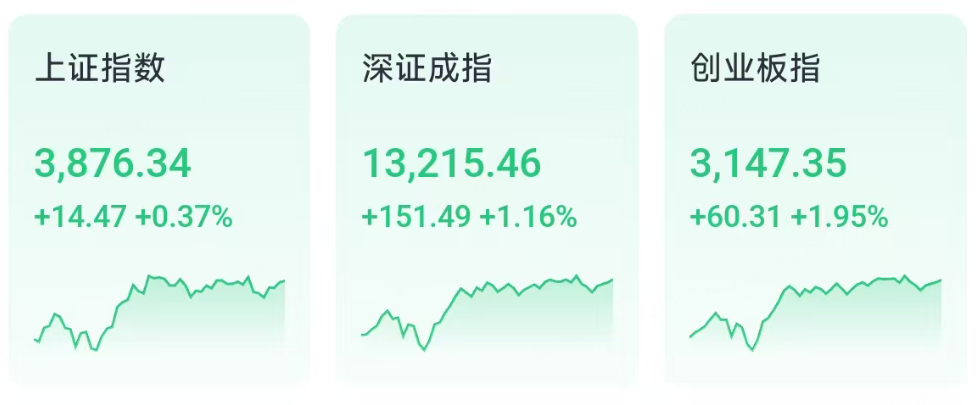 今日市场震荡走高,创业板指涨幅领先,权重股宁德时代再创新高。截至收盘,沪指涨0.37%报3876.34点,深成指涨1.16%报13215.46点,创业板指上涨1.95%报3147.35点。