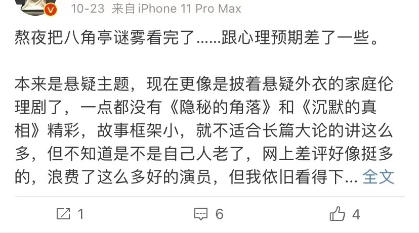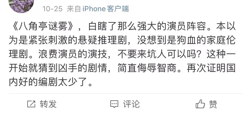 “披着悬疑外壳的家庭伦理剧”,这是观众对《八角亭谜雾》的最大槽点。作为悬疑剧,剧中对家庭关系的描述篇幅过多,并且“原生家庭”、“女性话题”每个热议话题都想涉足,刑侦探案内容却微乎其微,最终,导致故事主线支离破碎。故事过半,观众甚至还没理清主角的行为和动机。