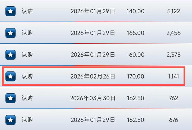 期权方面,百度上午的前十大合约中有七张是认购合约。其中,一张2月26日到期的认购合约,行权价170港元。
