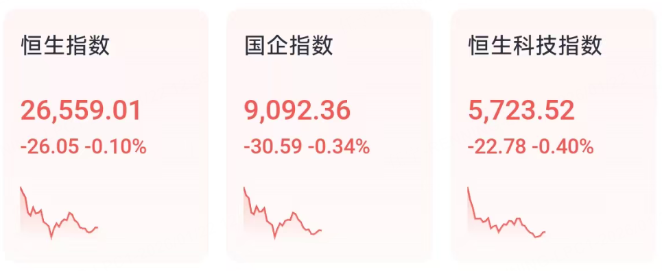 1月22日周四,港股三大指数上午高开低走。截至午间收盘,恒生指数跌0.1%,国企指数跌0.34%,恒生科技指数跌0.4%。