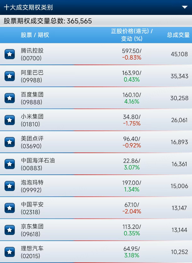 上午,港股股票期权合约成交365565张合约。腾讯排名榜首,阿里、百度、小米、美团等紧随其后。