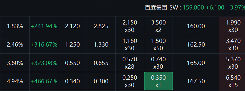 随着股价大涨,百度认购合约的价格普涨,其中一张本周五到期的CALL,行权价167.5港元,暴涨466.67%。