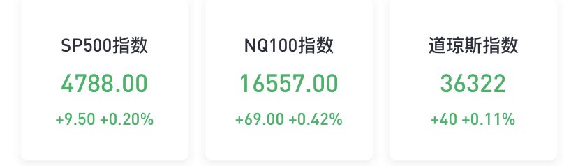 美国三大股指期货盘前上涨,截至发稿,道指期货涨0.11%;标普500指数期货涨0.20%;纳斯达克100指数期货涨0.42%。 欧股