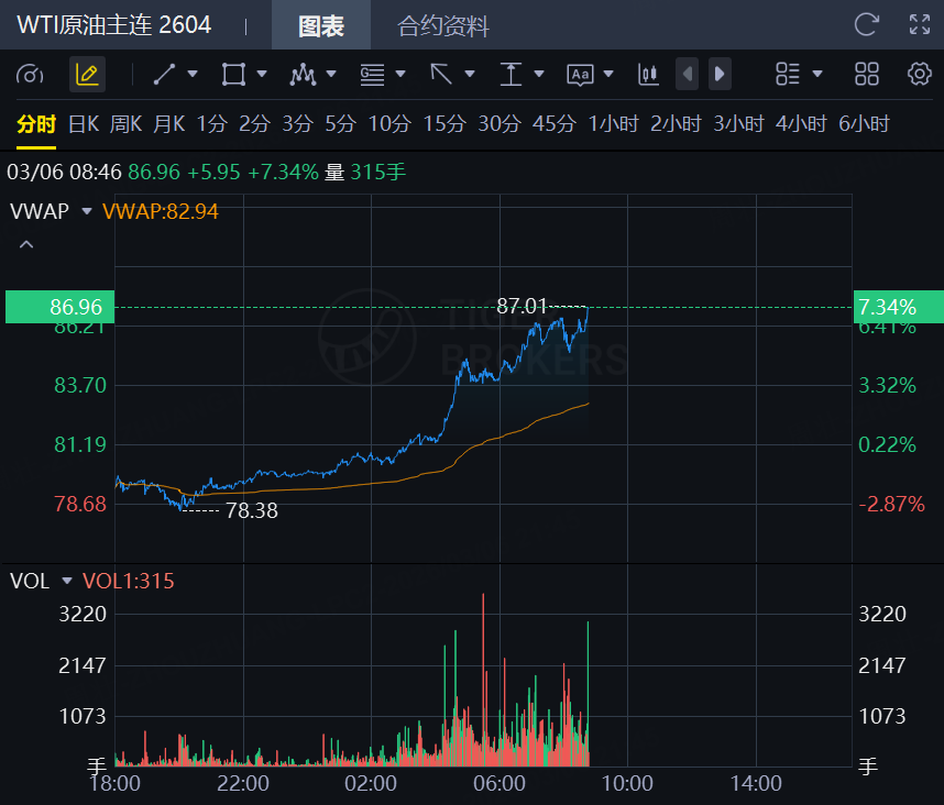 3月6日,国际油价涨幅进一步扩大!WTI原油日内涨超7%,报86.96美元/桶;布伦特原油日内涨5.33%,报89.96美元/桶;市场消息:欧佩克成员讨论进一步减产和炼油产能。科威特因储油罐已满而削减部分油田的石油产量;沙特阿拉伯、阿联酋的仓储设施也已接近极限。